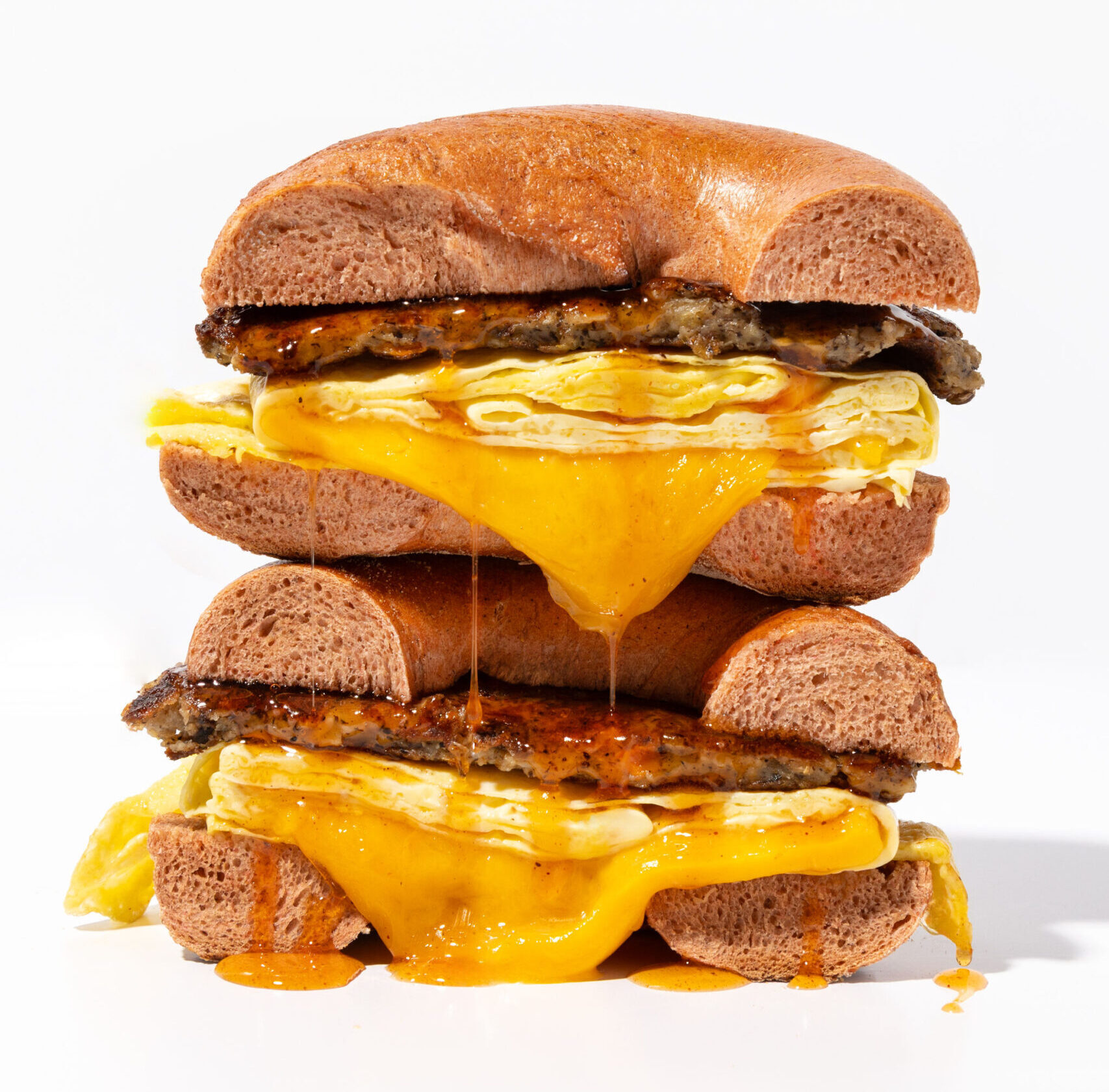 A flavorful twist on Spread Baglery's popular bacon, egg and cheese - Chef Omar's Sweet Heat Sandwich features a black-eyed pea scrapple patty, house-made hot honey, and cheddar cheese.