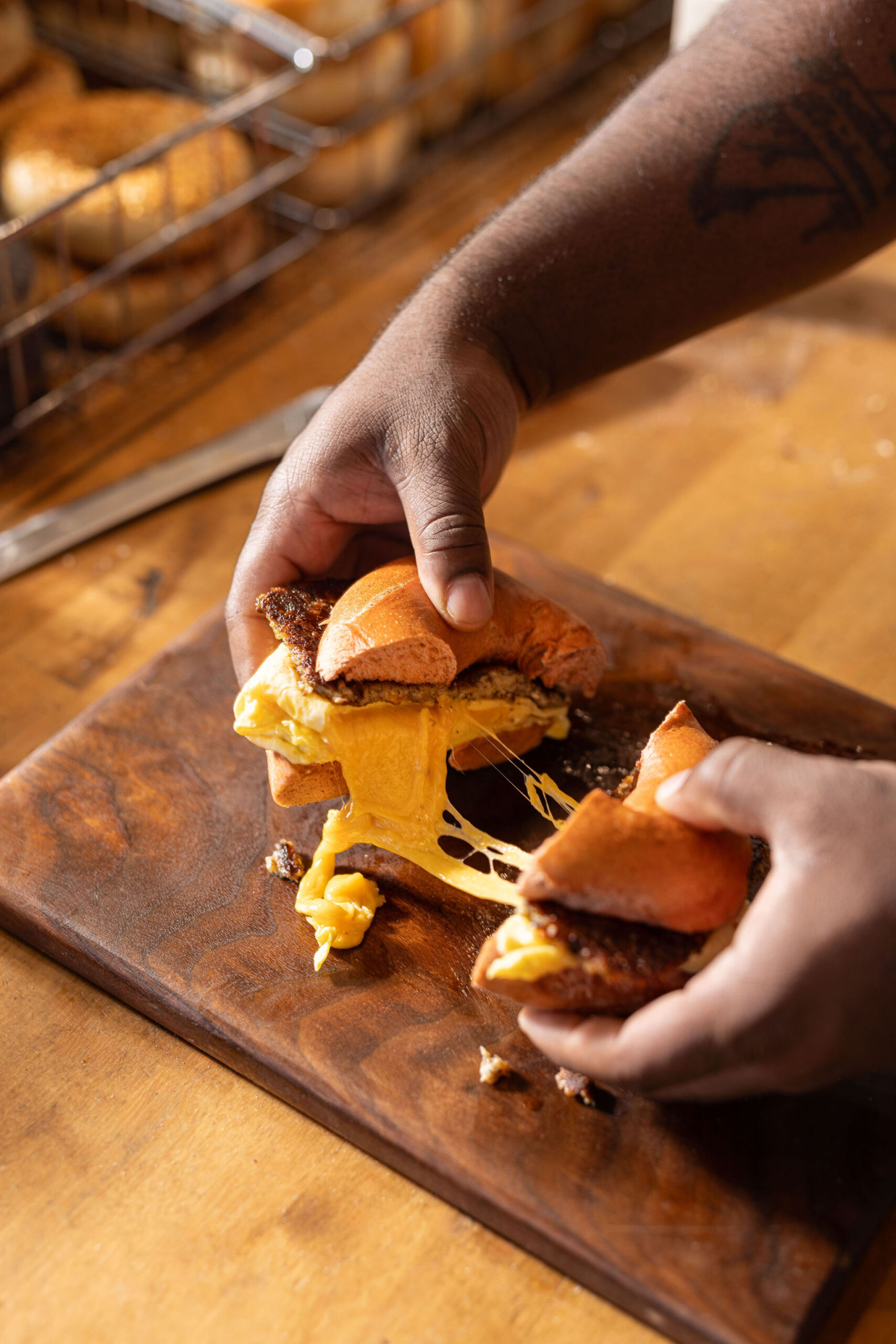 A flavorful twist on Spread Baglery's popular bacon, egg and cheese - Chef Omar's Sweet Heat Sandwich features a black-eyed pea scrapple patty, house-made hot honey, and cheddar cheese.